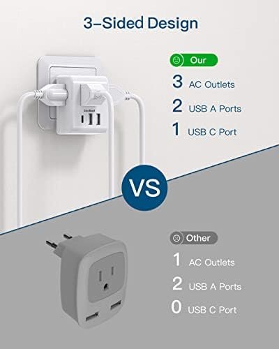 【6 in 1 EU Power Adapter】- The European travel plug adapter turns 1 European Type C outlet into 3 standard American outlets, 2 USB-A and 1 USB-C charging port, Max Capacity Up to 2500 Watt (max 250 Volt, 10 A); 3 USB Ports can charge up to 3.1A, allowing you charge 6 devices simultaneously. ideal for cell phone, tablet, power bank and other electrical chargers; No need to carry extra adapter and power strip for your traveling, a small US to Europe plug adapter can save your suitcase space