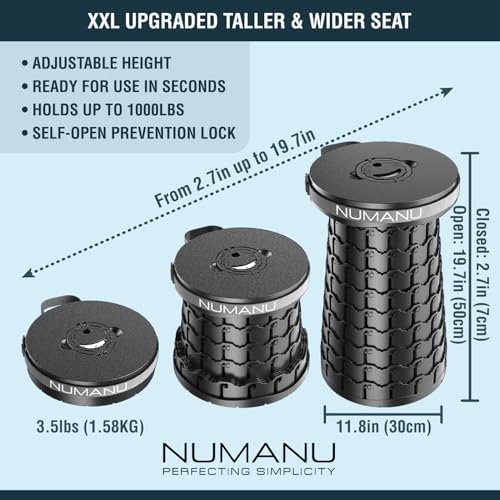 đă2024 UPGRADED, PATENTED, TALLER & WIDER XXL STOOLăWider, Taller, Thicker, Stronger – A Patented XXL Heavy Duty version of the popular Portable Collapsible Stool Telescoping Chair. 19.7″ Tall and 11.8″ Wide surpassing other Folding Stools on the market. Choose NUMANU, a US-based seller – for a safer, sturdier and more comfortable seating experience with a Lifetime Manufacturer’s Warranty for your Retractable Folding Stool.