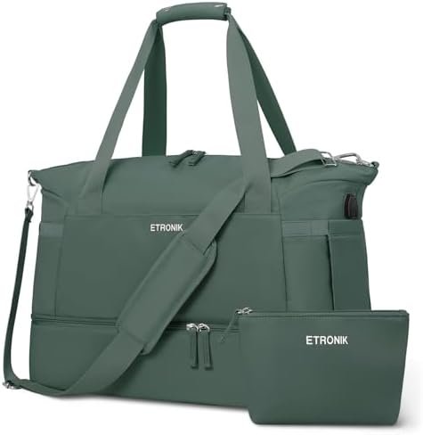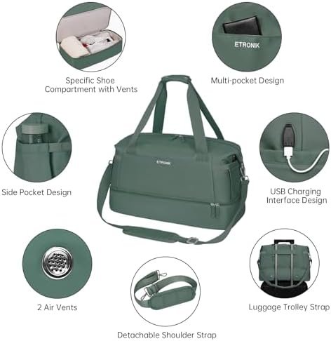 Separate Shoe Compartment with Vents:This large weekender bag has a separate compartment on the bottom for your shoes and dirty clothes. And the shoes compartment has 2 air vents to disperse the bad smell of shoes