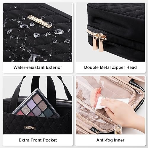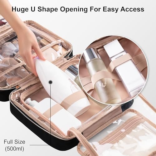 STAY ORGANIZED & EASY ACCESS: This bag features 4 compartments, with multiple pouches designed for cosmetics securely holding small items; Elastic bands keep bottles upright; A front pocket offers additional storage and quick access to makeup essentials.