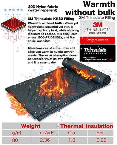 3M Thinsulate Insulation Filling, warm yet lightweight, powerful yet thin. It helps trap body heat, while allowing moisture to escape; Featherless, ECO-FRIDENDLY, a kinder alternative to feathers; Water Resistant, 100% Polyester, synthetic fibers absorb less than 1% of their weight in water; 20D nylon fabric, soft, skin-friendly, ultralight, durable, and windproof