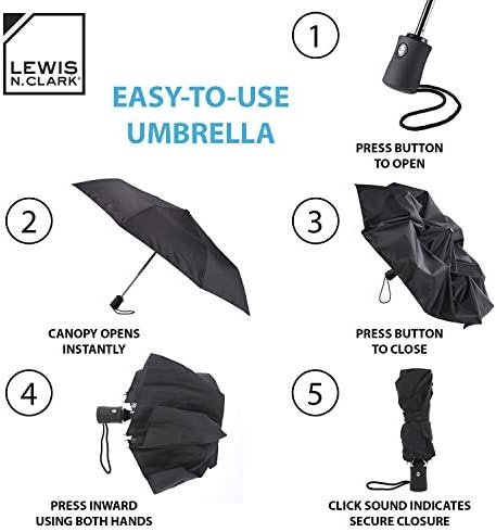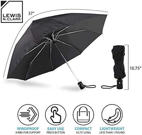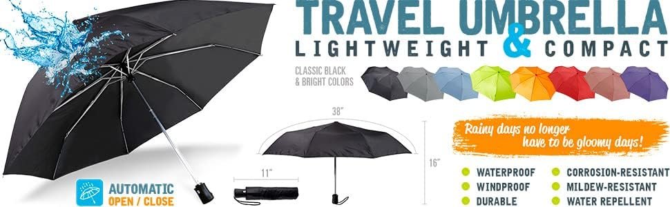 PORTABLE, COMPACT & LIGHTWEIGHT: Full size umbrella, 38in canopy,16in arm length. One touch auto opens/close button. Folds down into a compact 11in storage sleeve to fit in your car, tote, duffel bag, briefcase, backpack, purse, diaper bag; weighs 10 oz