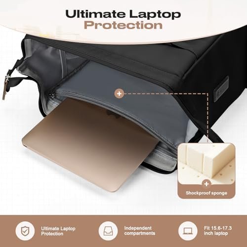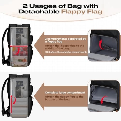 Spacious and versatile design: The main compartment of work bag has a removable Velcro divider, allowing you to divide the main bag into two layers. Attach the Velcro to the bottom for a large single compartment or to the middle for two separate layers. The upper layer is ideal for clothes, headphones and so on, while the lower layer is perfect for lunch bags. Plus, there’s a dedicated compartment with excellent cushioning for 15.6-17.3 inch laptops.