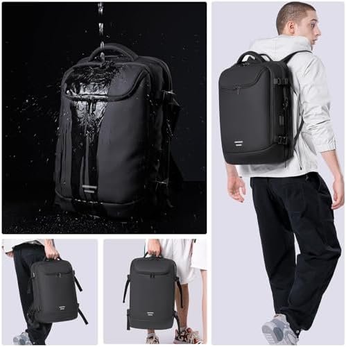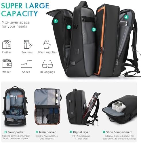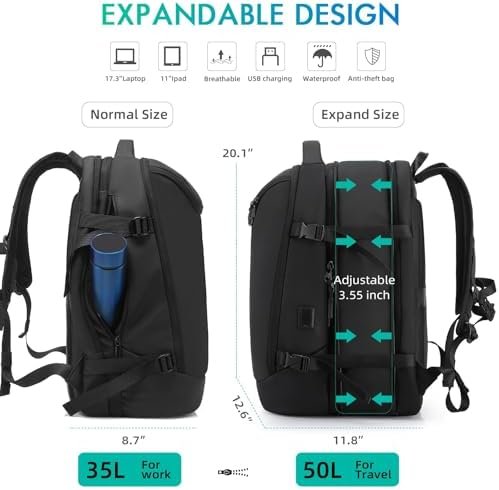 [36L-50L EXPANDABLE DESIGN]: The extra large carry on backpack with expandable feature gives you a spacious capacity experience. Normal state is 36L, dimensions are 19.6×8.7×12.2inch. After extended is 50L, dimensions are 19.6*11.4*12.2inch. Our suggestion is 50L backpack more suitable for tall people, recommended 5.91 feet and above. 160 pounds and above people use, more suitable for men, because the backpack is large, suitable for 5-7 days of travel