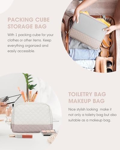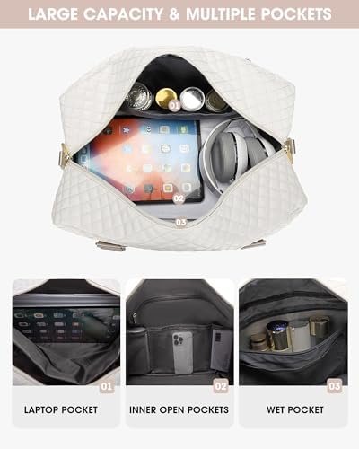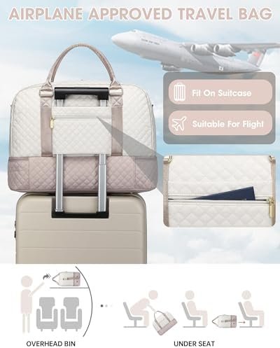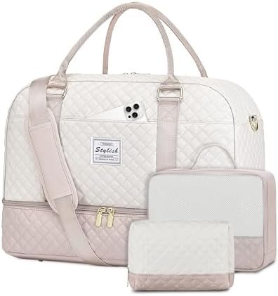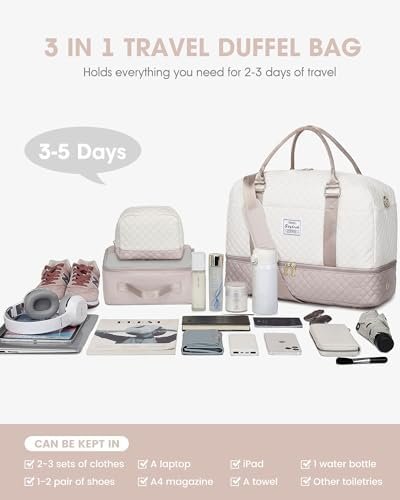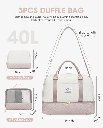 【Upgraded 3 Pcs Set Weekend Bags】:The travel bag for women comes with updated 3 Pcs Set: 1 travel duffel bag +1 clothing packing cube +1 toiletry/makup bag. Roomy space can even fit in 3-5 days of daily essentials. The packing cube with a clear mesh can help you keep clothes fresh, and easily tell where everything is. Help you organize and maximize your space when travel.