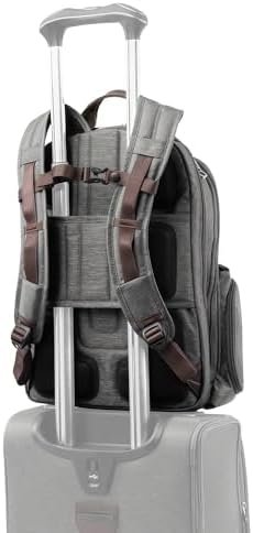 Unobtrusive rear strap fits around the extension handle of a rolling suitcase for secure stacking and hands-free mobility. Leather carry handle and adjustable shoulder straps provide carrying options and redistributes load weight for superior comfort.