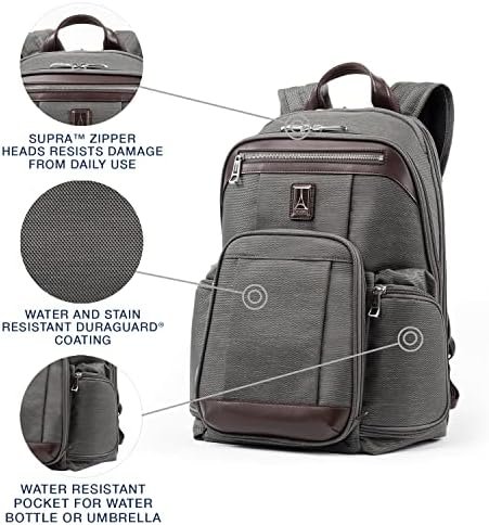 Sophisticated backpack is designed for business and travel with style and class. High-density nylon fabric with duraguard coating resists stains and abrasions. Supra zipper heads are engineered to resist damage from frequent use and abuse.